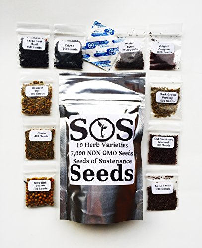 Naturally selected and grown, these seeds are guaranteed to provide a healthier, organic alternative to your industrial grown local produce. All of our Seeds of Sustenance are hand-packaged and provided for the people at the lowest price. Our mission is to supply people with a means to grow and harvest a more natural future. Basil, Cumin, Parsley, Chives, Cilantro, Mustard, Oregano, Lemon Mint, Dill Bouquet, Winter Thyme. Over 7000 seeds total with Oxygen Absorber