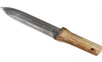 Hori-Hori, sometimes referred to as a "soil knife" or a "weeding knife", is a heavy serrated multi-purpose steel blade for gardening jobs such as digging or cutting. The blade is sharp on both sides and comes to a semi-sharp point at the end.