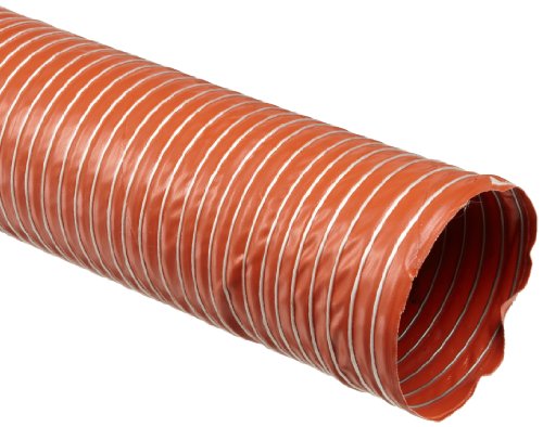 The Flexaust Heat-Flex BDS fiberglass duct hose, used for high temperature ventilation and fume exhaust applications, is an iron-oxide red, silicone-coated, single-ply fiberglass fabric hose, reinforced with a spring steel wire helix and external filament fiberglass cord. It resists water, fungus, ozone, alkalis, and a wide range of oils and solvents, and is very flexible and compressible for easy manipulation. A temperature range of -65 to 550 degrees F makes it suitable for such applications as brake ducting and hot-air drying systems. This non-kinking fiberglass duct hose has a narrow-pitch helix to allow a short bend radius while maintaining efficient air flow.