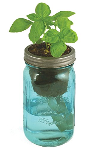 Herb Garden Kit - Self-watering indoor planter with organic basil seeds - Simple set-up and fertile with success - Features a blue mason jar outfitted with a passive hydroponic system - Great gift for city dwellers, home chefs and more! Made in USA.