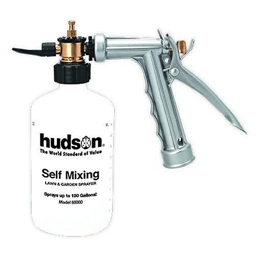 This Hudson Self-Mixing Hose End Sprayer has 16 settings for precise mixing and three spray patterns for shrub, lawn and tree applications. Nozzle can be adjusted to spray a 30ft. stream. Built to last with a sturdy brass mixing head and reusable poly bottle. The metal spray handle connects directly to garden hose. Adjustable Spray: Yes, Spray Pattern: Flooding fan, stream, Pressure (PSI): 40-60, Fitting Size (in.): 3/4, Spray Distance (ft.): 30, Nozzle Type: Adjustable