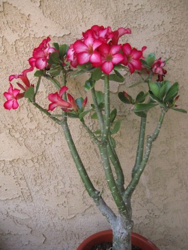 The Desert Rose is a native of East Africa. It will grow from 6 1/2 to 10 feet in the wild. It has fleshy leaves and beautiful 2-inch pink open-trumpet shaped flowers. It is a succulent, and forms more of a bush than a tree. It makes an excellent house plant or indoor bonsai. Needs lots of light and fresh air. Keep in a bright location in winter. In summer, if possible, move outdoors to a sunny or partly shaded location. Growing temperature should not be below 54 degrees. However, in the winter, keeping it cool (between 54-61 degrees) whch gives the plant a needed rest. Needs little water during winter, especially when kept cool. Increase water during growing and blooming periods. The total watering needed is similar to crassula, portulacaria and other succulents, and it will lose leaves if overwatered.