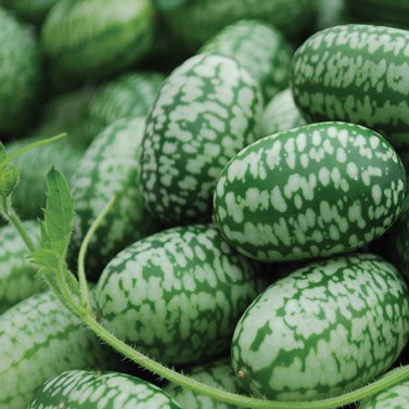 Mexican Sour Gherkins (aka Mexican Mini Watermelons) (Melothria scabra) Newly rediscovered heirloom. Produces abundant crops of 1-2" fruits reminiscent of tiny watermelons that fall off the vines when ripe. Sweet cucumber flavor contrasted by a surprising sourness, as if they are already pickled. Great for growing on a trellis. 60-70 days.