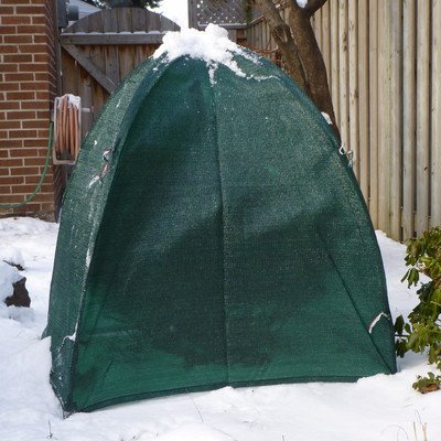This winter shrub covers protect shrubs from the damaging affects of severe winter conditions. The specially engineered synthetic fiber material protects the shrubs from heavy snow build up, freezing rain and strong wind. The fiber material allows light penetration and air flow, critical for plant survival. Comes with 4 ground spikes. Available in hunter green color. Measures 40-inch length by 40-inch width by 44-inch height.