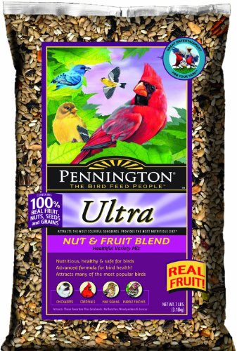 Pennington Ultra Nut & Fruit Blend attracts a wide variety of native songbirds to your feeders. This appealing, premium mix of healthful seeds, grains, nuts and fruit pieces is fortifed with nutrients. This high energy blend is ideal for year-round feeding. Ingredients: Hulled Sunflower, Peanuts, Sunflower, Safflower, Raisins, Hulled Pumpkin Seed, Pistachios, Almonds, Pecans, Walnuts, Dried Cherries, Ground Wheat, Ground Corn, Salt, Soy Oil, Dehulled Soybean Meat, Vitamin A Supplement, Vitamin D-3 Supplement, Potassium Iodide, Vegetable Oil, Choline Chloride, L-Lysine, Ferrous Sulfate, Vitamin B12 Supplement, Manganous Oxide, Vitamin E Supplement, Zinc Oxide, DL-Methlonine, Niacin, Riboflavin Supplement, Menadione Sodium Bisulfite Complex (source of vitamin K activity), Cholecalciferol (source of vitamin D3), Mixed Tocopherols (a natural preservative), Copper Sulfate, Calcium Pantothenate, Pyridoxine Hydrochloride, Thiamine Mononitrate, Folic Acid, Calcium Iodate, Biotin, Cobalt Carbonate, Sodium Selenite, Artificial Color, Artificial Cherry Flavor.