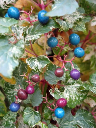 Porcelain vine is a vigorous, woody, deciduous, tendril-climbing vine which is somewhat similar in habit to wild grape vines. Features mostly 3-lobed, deep green & white leaves (to 5 inches long). Clusters of greenish flowers appear in the leaf axils in July. Flowers give way in fall to showy clusters of rounded-to-oval, pale lilac-blue fruits (1/4 inches diameter) which mature to brighter and deeper shades of amethyst to porcelain blue.