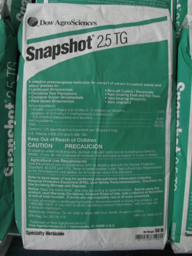 Snapshot - 50 Pound bag Active Ingredient: trifluralin and isoxaben For use on: Landscape Ornamentals Christmas Tree Plantations Container and Field Grown Ornamentals Non-Bearing Fruit and Nuts Trees and Vineyards Non-Cropland Snapshot 2.5 TG specialty herbicide provides up to eight months of control for 111 broadleaf and grassy weeds in 413 field-grown and 235 container-grown ornamentals without harming them. Features Controls more broadleaf and grassy weeds in more ornamental s than any other preemergent herbicide Provides excellent plant tolerance and long-lasting broad-spectrum control Bonds tightly with soil particles and is low in water solubility, so it won?t move out of the application zone Weeds Controlled Barnyardgrass Bittercress Common chickweed Foxtail Goosegrass Marestail Oxalis Ragweed Spurge