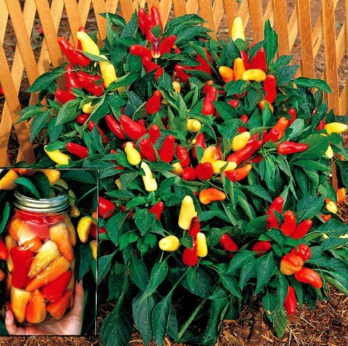 These peppers are about 2 inches long, tapering to a blunt end. Thick-walled and very sweet, they hold up beautifully on the plant, and keep their color, shape, and texture nicely when pickled. So appealing as they ripen into warm shades in the sunny garden!