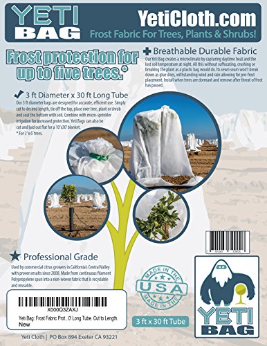 Frost protection fabric for up to five trees (3 ft x 6 ft). Our Yeti Bag creates a microclimate by capturing daytime heat and the lost soil temperature at night. All this without suffocating, crushing or breaking the plant as a plastic bag would do. Its sewn seam won't break down as glue does, withstanding wind and rain allowing for pre-frost placement. Install when trees are dormant and remove after threat of frost has passed. Our 3 ft diameter bags are designed for accurate, efficient use. Simply cut to desired length, tie off the top (not included), place over tree, plant or shrub and seal the bottom with soil. Combine with micro-sprinkler irrigation for increased protection. Used by commercial citrus growers in California's Central Valley with proven results since 2008. Made from continuous filament Polypropylene spun into a non-woven fabric that is recyclable and reusable.